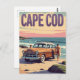 A highly nostalgic, vintage-style travel poster featuring an artistic illustration of Cape Cod, Massachusetts. The design captures a perfect summer day with a classic woodie station wagon parked on the beach, with surfers heading to the waves beneath a beautiful sunset sky. This retro-inspired artwork is perfect wall décor for travel enthusiasts, fans of New England and surf culture, and those who appreciate mid-century modern aesthetics and coastal art prints.
