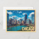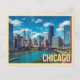 Um cartão postal estilo vintage impressionante mostrando a linha do horizonte de Chicago, com seus arranha-céus impressionantes sobre o rio Chicago. As cores vibrantes e clássicas e o filtro retrorreflector dão a esta imagem um autêntico sentimento de poster viagens vintage, evocando a rica história e a beleza arquitetônica da cidade. Este cartão é perfeito para enviar uma mensagem refletida, comemorando uma viagem à cidade de Windy, ou enquadrar-se como uma pequena peça de arte urbana. Um design excelente para qualquer pessoa que ame Illinois, visões de cidade ou designs clássicos de paisagem urbana americana.