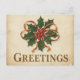 Festive restored antique Christmas card illustration featuring colorful spray of green and red holly gathered in a red bow with a shiny brass bell, cute bird and Merry Christmas message in fancy gold script.