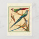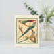 Cartão postal com uma imagem de safena melhorada e limpa digitalmente de uma Conura de Olho Branco, um periquito Malabar, e um periquito de tampa azul, com borda e verso amarelo-claro. Ilustração colorida da história natural de W. Rutledge do The Illustrated Guide of Canaries and Other Cage-Birds, 1878.