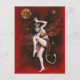 Este cartão postal é ilustrado com uma dama do diabo vintage colocada antes de um fundo vermelho com uma lua do crânio gótico e estrelas.
