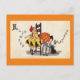 Imagem vítrea de uma garota e um garoto com um gato preto e abóbora, é mostrada neste cartão postal do Dia das Bruxas. Na frente do cartão-postal lê-se "Saudações de Halloween" e no verso do cartão-postal lê-se "Feliz Truque ou Tratar Também!" Um cartão postal bonito para enviar família, amigos ou filhos!