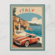 Qualquer um adoraria receber este cartão postal de viagem vintage, com a ilustração retrógrada de um carro italiano e de uma praia na costa italiana!