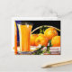 Linda vintage Ad (cerca de 1920) mostrando frutas e flores laranja maduras e lúcidas em uma cesta, acompanhadas de um cheio de suco de laranja delicioso sentado em um pires. Artista: G. Mitchell