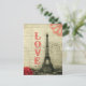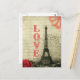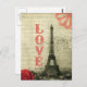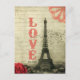 Esta carta de posto romântica de Paris apresenta uma imagem antiga da Torre Eiffel com a palavra "Amor" escrita em letras rosa e antiquadas. Uma velha carta de amor francesa está esmaecida ao fundo. com