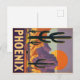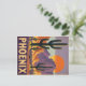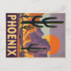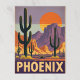 Um poster de viagens ao estilo vintage captura uma dramática paisagem desértica perto de Phoenix, Arizona, com cactos saguaro altos, montanhas robustas e um grande cenário de sol laranja contra um céu roxo e azul. "PHOENIX" aparece de forma destacada na parte inferior.
