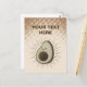 Cartoon avocado e fundo em cores sépias. Cartões postais personalizados. Editar texto para personalização. Ideia de presente para amantes do abacate.