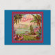 Ilustração de um rótulo de charuto antigo chamado El Tropico. Plantação tropical excelente com plantas, flores e frutas. Casa de plantações brancas com fundo muito colorido.