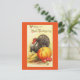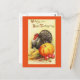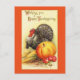 Foto vintage de um peru com milho, uma abóbora e maçãs agarra a frente deste cartão postal. Enviar um desejo por uma Feliz Ação de Graças faz com que isso seja perfeito para manter contato com a família e amigos para este feriado!