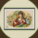 Cartaz vintage bonito com uma jovem, possivelmente uma cigana, tocando violão. As cores maravilhosas são azul-laca e azul-aqua, vermelho-rosa, pêssego, ouro, lilás, preto e creme. A bela figura está rodeada de adorável decoração floral. Esta imagem data de 1870-1890 e foi apresentada num rótulo de cigarro. A imagem original reside no The New York Public Library Digital Collections. A imagem aqui foi aprimorada e enquadrada.