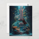 Uma guitarra elétrica submersa na água, com coral e peixe ao seu redor.