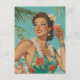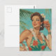 Uma mulher glamourosa com um vestido floral e o lei havaiano desfruta de um cocktail debaixo de palmeiras, irradiando charme retrô-ilha e felicidade de férias.