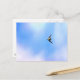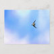 Andorinha estilizada voando através de um céu azul sonhador e nublado.