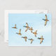 Dez patos-reais voam em formação através de um céu azul brilhante.