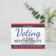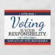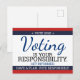Votar é sua responsabilidade. Fique informado. Tenha um plano. Votem com responsabilidade. Votar a design do cartão postal eleitoral de 2020. A votação informada é a nossa superpotência e a nossa responsabilidade. Descrição do design: O esquema de cores é vermelho, azul, branco e preto. As partes superior e inferior têm uma faixa vermelha horizontal, com uma faixa azul horizontal ligeiramente mais larga abaixo da faixa vermelha superior e acima da faixa vermelha inferior. No meio está um quadrado branco que é usado como canvas. O meio tem a palavra "Voting" em um grande roteiro azul no meio superior, e abaixo dela estão essas palavras em todos os bonés da serifa negra, em duas linhas, "é sua responsabilidade." Por baixo disso, mas ainda no espaço branco, espaçado em duas linhas, estão as palavras em azul, todas as bonés serif, "Fique informado." A última linha, "Tenha um plano. Vote responsavelmente" está na faixa azul inferior na fonte branca do serif. Na faixa azul superior estão as palavras "Vote 2020" é um modelo em boné branco serif com uma estrela à esquerda e à direita das palavras. Embora este design seja não-partidário, você pode personalizar facilmente o texto do modelo para ler "Vote Blue 2020" ou "Vote Biden 2020". Personalize suas cores. Nota: Este design está estruturado de modo que as faixas vermelhas no topo e na parte inferior estejam na área de trim, de modo que possam estar mais estreitas na versão que você recebe.