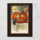 Vintage Halloween arte apresentando fadas, gato preto e abóbora.