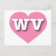 Este cartão-postal apresenta um legal coração cor-de-rosa contendo as letras maiúsculas, brancas e em negrito WV, a abreviação oficial para West Virginia, o estado da montanha. O reverso do cartão postal é vazio, aguardando seu texto personalizado ou sentimentos escritos à mão.