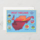 Cartaz vintage de West Virginia reimprimindo com uma silhueta de mapa do estado cheia de uma foto do pôr do sol. O slogan "Estado das Montanhas" está no topo, e os pequenos ícones de ilustração da vinheta incluem áreas de vida selvagem, campismo e pesca, Primaveras de Enxofre Branco, Montanhas Appalachianas, parques estaduais e florestas, e campos de batalha históricos.