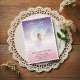 • A beautiful watercolor invitation featuring a fairy sitting gracefully on a crescent moon, set against a dreamy pink and purple sky with a distant castle silhouette. The design is framed by a sweet pink gingham border, perfect for a magical princess or fairy-themed baby girl shower.