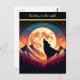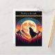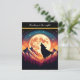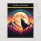 Um lobo solitário abocanhou-se contra uma lua de cheio, uivando à noite, com um céu estrelado e montanhas ao fundo.