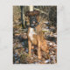 Este bonito boxeador está desfrutando de uma caminhada na floresta de inverno. Ele está sentado em folhas e em frente a árvores nuas e arbustos.