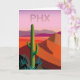 Este design é um poster contemporâneo com uma expressão gráfica simples da paisagem do deserto no vermelho, no rosa e no roxo mornos com o cacto do saguaro no primeiro plano. A abreviatura "PHX" do texto aparece no auge do poster e da "arizona" no tipo branco pequeno no fundo.