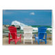 Cadeiras de Adirondack vermelhas, brancas e azuis na praia, com ondas quebrantes em rochas.