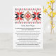 A frente deste cartão tem uma borda bordada de estrelas vermelhas e pretas e diamantes castanhos, e a oração do espírito Excelente nativo americano (traduzida por Lakota Sioux, chefe da Lark Amarela, em 1887): Oh, Espírito Excelente, cuja voz ouço ao vento, cuja respiração dá vida a todo o mundo. Ouça-me. Preciso da sua força e sabedoria. Deixe-me caminhar em beleza, e fazer meus olhos encararem o pôr do sol vermelho e roxo. Faça minhas mãos respeitarem as coisas que você fez e meus ouvidos afiados para ouvir sua voz. Me faça sábio para que eu possa entender as coisas que você ensinou minhas pessoas. Ajude-me a permanecer calmo e forte diante de tudo que vem em minha direção. Deixe-me aprender as lições que você escondeu em cada folha e rocha. Ajude-me a procurar pensamentos puros e a agir com a intenção de ajudar os outros. Ajude-me a encontrar compaixão sem empatia me esmagando. Eu busco força, não para ser maior que meu irmão, mas para lutar contra meu maior inimigo, eu mesmo. Faça-me sempre pronto para vir até você com mãos limpas e olhos heteros. Então quando a vida desaparece, como o pôr do sol desaparecendo, meu espírito pode vir até você sem vergonha. Tem um pedido? Me mande e eu voltarei com você.