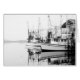 Barcos de camarão no cais numa manhã embaçada, preto e branco, reflexões sobre a água