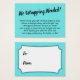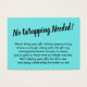 Se você estiver hospedando um chá de exibição sem presentes para uma noiva para ser, este cartão simples e divertido pode ser a escolha para você. Usando uma fonte elegante de script, adicionei primeiro um cabeçalho que dizia "No Wrapping Neanced!" na frente, e "To" e "From" para o lado da etiqueta de presente. O campo de modelo foi criado para oferecer instruções aos convidados que não embrulhassem o seu presente; por favor, sintam-se livres para alterar a redação da forma que quiserem. Há muitos alternativos populares neste texto, se você quiser uma mudança. Todas as fontes e cores podem ser modificadas conforme você vê o ajustado.