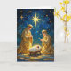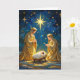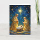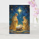 Celebre o verdadeiro significado do Natal com este cartão deslumbrante que apresenta uma cena radiante do presépio. A Sagrada Família é lindamente iluminada sob a Estrela de Belém, rodeada por detalhes dourados cintilantes e um céu noturno tranquilo. Perfeito para enviar bênçãos de Natal sinceras, este cartão em branco por dentro permite que você adicione sua própria mensagem pessoal para amigos e entes queridos. Um design atemporal que captura a maravilha e a alegria da época.