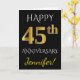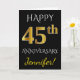 Este simples e personalizado design de cartão de saudação de aniversário de casamento apresenta a mensagem "FELIZ 45º ANIVERSÁRIO DE CASAMENTO", com o "45º" tendo uma aparência semelhante ao ouro. A frente também apresenta um nome personalizado e um fundo preto. O interior apresenta uma mensagem de saudação de aniversário de casamento personalizada. Poderia ser dado ao marido ou à esposa em celebração do quadragésimo quinto aniversário de casamento do casal.