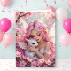A pretty pink anime elven fairy holding her cute white baby dragon birthday card.