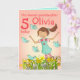 Cartão de aniversário em pêssego e design aqua com uma garota de cabelo escuro auburn. Personalize com seus detalhes. Este cartão diz "Nossa querida neta Olivia 5 hoje. Dentro: "Parabéns". Cartão divertido projetado exclusivamente por Sarah Trett. www.sarahtrett.com para www.mylittleeden.com com.au com.au