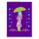 Esta ilustração de arte do vetor primavera apresenta uma menina bonita com um guarda-chuva verde, uma capa de chuva roxa, cabelos azuis e cachos de flores rosa, azuis, amarelas e laranja brilhantes e coloridas, paradas na chuva! Este trabalho de arte engraçado e na moda é o presente perfeito para qualquer um que ama arte original e bela de desenho animado e tempo de primavera!
