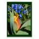 Uma tulipa vermelha/amarela protuberante com flores azuis