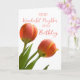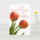 Cartão de aniversário para vizinho com tulipas primavera cor de laranja e rosa e verso pensativo.