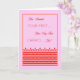 Primeiro cartão de sobrevivência de quimio em um bonito cor-de-rosa com escrevendo vermelho e um impressão listrado em vermelho na parte inferior do design sob o escrevendo. Há também uma fina borda vermelha e amarela ao redor do escrevendo e design.