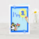 primeiro aniversario com palhaço engraçado, pinguim, sorvete e balões, sobre fundo azul. Personalize facilmente este design, adicionando ou alterando o texto.