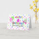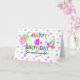 Um cartão de aniversário do partido do divertimento para uma neta de 1 ano com confetes no fundo em cores pastel, no centro com "primeiro aniversario feliz colorido" e na "neta" no preto. No lado esquerdo das palavras você encontra um balão cor-de-rosa das bolinhas e um balão verde das bolinhas, um chapéu do partido no direito.