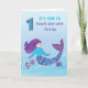 Para uma garota divertida que vai celebrar um primeiro aniversario é este cartão que mostra uma bela sereia no cobrir. Este cartão também vem com uma frente personalizável na qual você pode personalizar o cartão com o nome do celebrante.