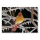 O pássaro cardinal fêmea é empoleirado com ramos gelados toda em torno dela.