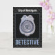 Personalize este cartão de parabéns bonito com a nova cidade, localização ou nome detetive! Um crachá policial com aspecto prateado está no centro com um padrão no fundo escuro. A palavra detetive está escrita em letras azuis fortes.