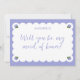Faça uma pergunta à sua madrinha de casamento com esta placa de proposta romântica, com tons suaves de periwinkle, bordas elegantes e ilustrações de hydrangea delicadas em cada canto. A pergunta manuscrita feita em conjunto com um nome personalizável cria uma aparência refinada, mas pessoal — perfeita para casamentos de primavera e verão com um tema jardim, floral, costeiro ou vintage. Pensado e na tendência, este cartão adiciona um toque doce à proposta do seu partido.