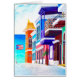 Pintura de uma rua em San Juan, Puerto Rico com a bandeira porto-riquenha, as construções coloridas e as plantas.