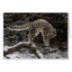 O filhote de leopardo-da-neve salta de uma árvore para pular na neve.