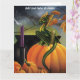 Um pequeno dragão verde giro sentado numa grande abóbora laranja numa noite negra de outono. Caldeirão, teia de aranha e vela ao redor do dragão.