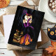Feiticeira loira sentada numa abóbora laranja grande. Do seu lado está uma gata negra numa pilha de livros. Por trás está uma floresta e um castelo.