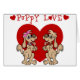 2 cachorros bonitinhos parados em frente a um grande coração vermelho e o termo Puppy Love está disponível em t-shirts, adesivos, sacos de tote, cartões de saudação, correntes-chave, canecas de café e muito mais.