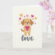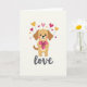 This card shows a biscuit-toned puppy centered on a creamy off-white background, looking up with wide glossy eyes, a small gentle smile, and rosy cheeks that read like a shy crush 🥰. The puppy cuddles a bright magenta heart against its chest, tied with a deep crimson bow like a sweet little gift. Above its head, smaller hearts float upward in blush pink, sunny yellow, and cheerful red, creating a soft trail that feels like affection rising into the air ❤️. Some of the hearts hang from thin curling lines while others drift freely, adding light movement around the pup. The lighting stays diffused and airy, keeping the pastel colors smooth and cozy rather than harsh. Near the bottom, the word “love” sits as a single line of text in deep charcoal, standing out clearly against the pale background. The puppy’s body is slightly angled with its paws wrapped around the heart, and the scattered hearts fan outward in a loose arc overhead.